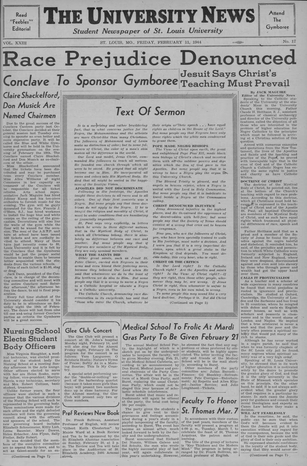 | Father Heithaus's speech was published on the front page of the student newspaper The University News, February 11, 1944 |
